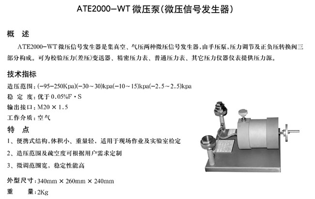 ATE2000—WT微压泵(微压信号发生器)金湖中泰仪表有限公司(原安科自动化仪表厂)是集科、工为一体的机械加工、仪器仪表生产的专业企业,公司主营产品:HART475、375、275、388手操器、智能压力表校验仪、真空压力表校验仪、便携式分体压力校验仪、温度校验仪,信号发生器,六氟化硫校验仪,精密数字压力表、数字式压力计、全量程压力校验仪、电磁流量计、涡街流量计、旋进旋涡流量计,压力变送器、液位变送器、温度变送器,台式液压,气压,压力泵、热电偶/电阻校验仿真仪,节流孔板,显示仪表,校验系统等自动化仪器仪表。产品广泛应用于电力、冶金、化工、油气、航空等领域,深受广大用户的好评。 公司自创建以来,始终秉承以市场需求为导向、以用户满意为宗旨、以品牌经营为核心经营的理念。通过不断的创新和投入推动公司持续发展。欢迎您的垂询